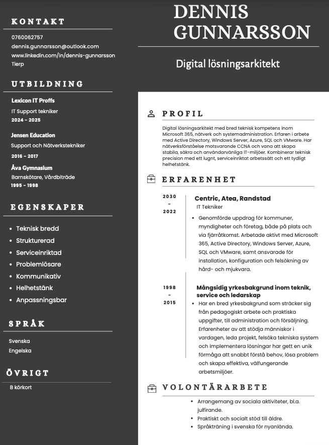 Att driva egen verksamhet har varit ett fantastiskt sätt att utvecklas, där varje uppdrag varit unikt. Mitt fokus har alltid varit att hitta lösningar som fungerar för varje kund, även när hemmiljön kan vara utmanande med barn, djur, släktingar och allt däremellan. Ibland kändes det ensamt, vilket gjorde erfarenheten som IT-konsult för större företag som Randstad och Atea extra värdefull, då jag fick möjlighet att samarbeta i team, utvecklas och lösa komplexa uppdrag tillsammans med andra.